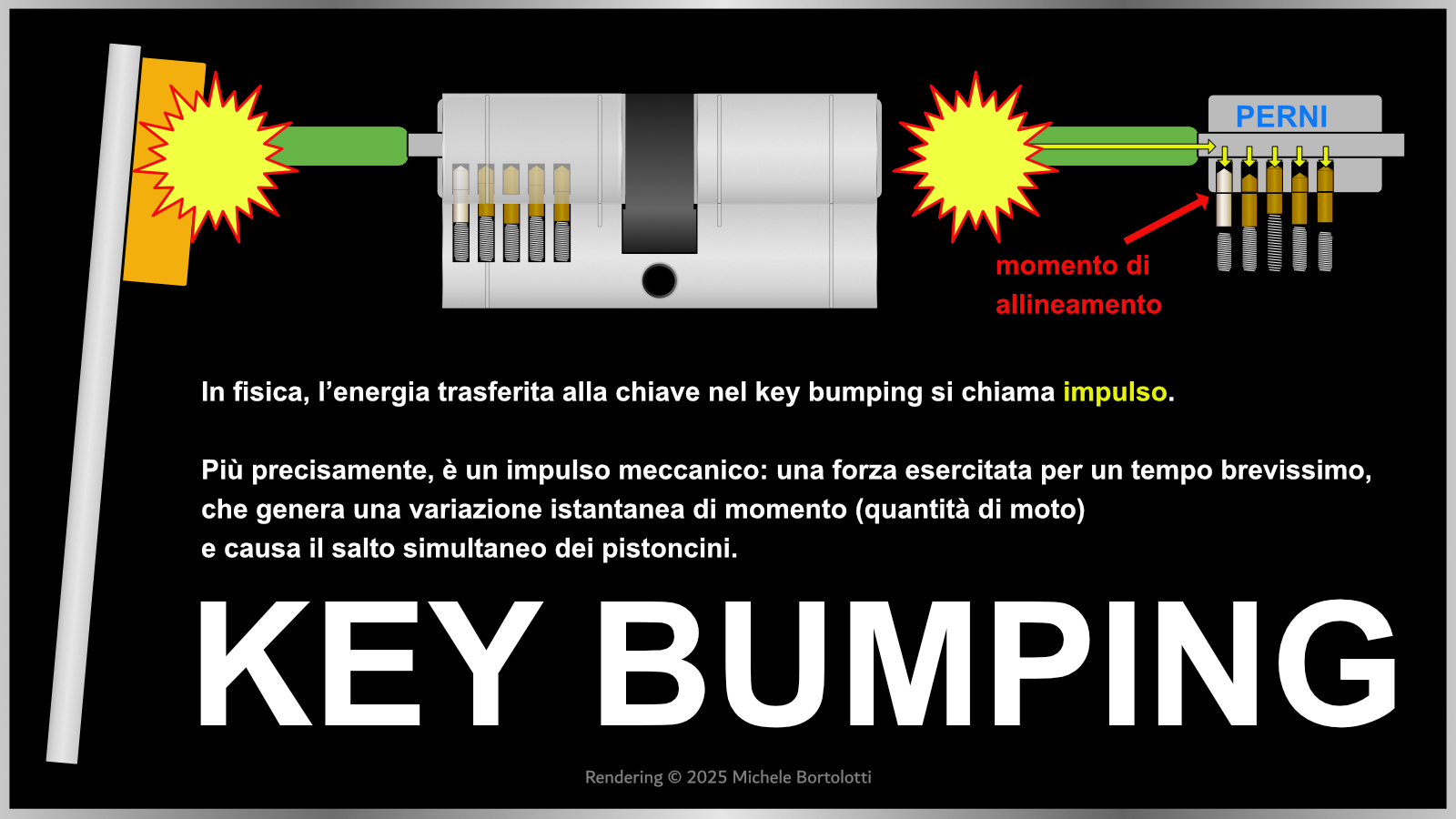 Per capire key bumping come funziona, immagina una chiave ad urto sagomata in modo da poter "scattare" tutti i pistoncini di un cilindro quasi contemporaneamente.